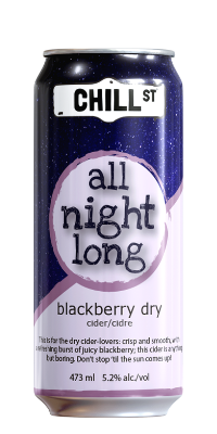 | Brand: Chill Street Cider Type: Flavoured – Blackberry Location of Brewing: Elmsdale, NS ABV: 5.2% Website Link: chillstreetcraftbeverageco.com Ingredients: N/A Gluten Free: Yes Sugar Content: N/A Size(s) available: 473ml (can) Availability: Chill St. retail, online store and locally in Nova Scotia Flavour: Blackberry Colour: Translucent, straw yellow Carbonation: Small, frequently streaming bubbles. |