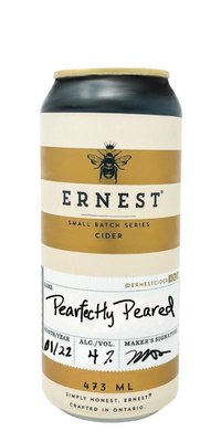 Additional Notes: The Pearfectly Peared offering by Ernest Cider Co is a unique pear offering. With very little sweetness (no sugar added, only natural sugars (contains sorbitol—an unfermented sugar as per their website), it is strong in crisp pear flavour. Slightly acetic, its bright and extra clean (only a little dankness in the aftertaste). Juicy, with peel and flesh aspects at different points. Reduced in all elements when on ice.