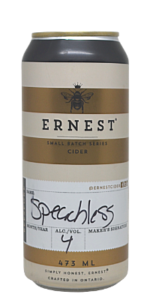 Additional Notes: The Speachless by Ernest Cider Co is a different offering for a peach cider. Peach elements come though much more sour than sweet, and more of a peach pit flavour than the flesh. Hops add a mild rugged bitterness. Apple notes are there, but not prominent. Some citrus-like notes from the hops and peach pit elements. Unfiltered but not gritty.