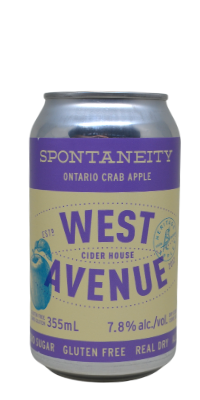 | Brand: West Avenue Cider House Type: Apple – Dry Location of Brewing: Flamborough, ON ABV: 7.8% Website Link: westavenue.ca Ingredients: N/A Gluten Free: Yes Sugar Content: N/ASize(s) available: 355ml (can) Availability: West Avenue Online and Retail Store Flavour: Crab apple Colour: Translucent, orange-yellow Carbonation: Small, infrequently-streaming bubbles |